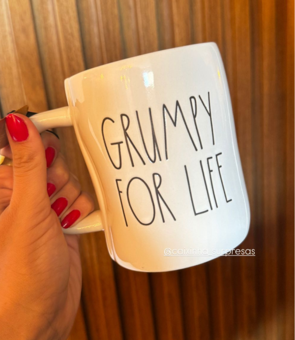 - FRASE “GRUMPY FOR LIFE” DECORANDO A PARTE DE TRÁS DA CANECA.