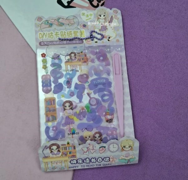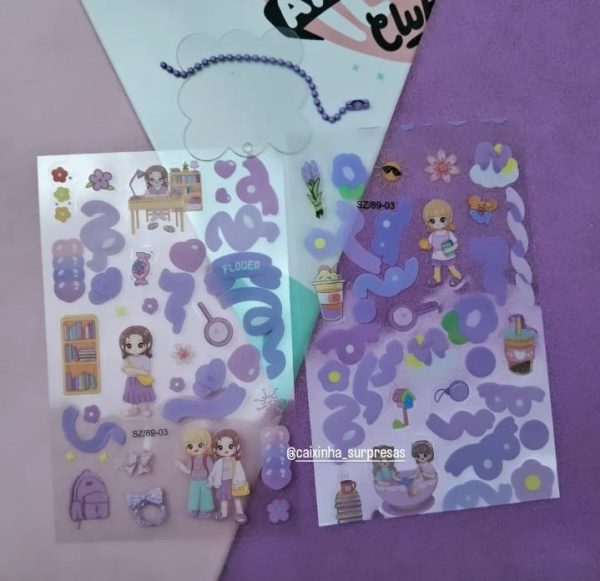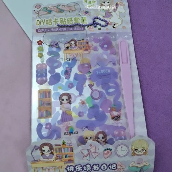 CONTÉM: 2 CARTELA, APROX. 50 ADESIVOS AO TODO, UMA PINÇA DE PLÁSTICO PARA MANUSEIO DE ADESIVOS, UM PINGENTE PARA COLOCAR ADESIVO E FAZER DE CHAVEIRO.