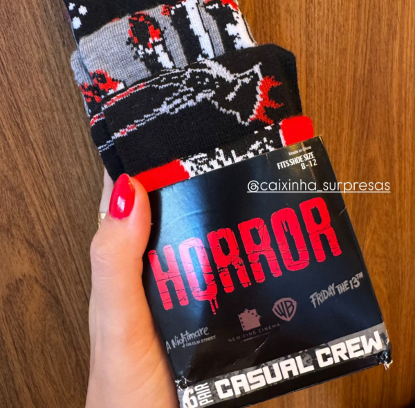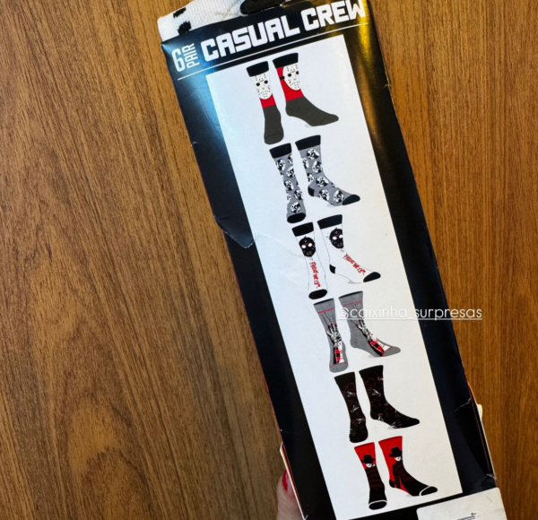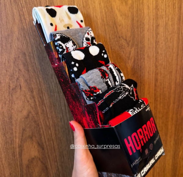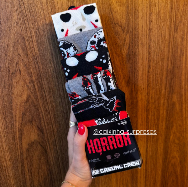 CONTÉM: 03 PARES DE MEIAS JASON VOORHEES (SEXTA FEIRA 13) E 03 PARES DE MEIA FREEDY KRUEGER (A HORA DO PESADELO), ESTAMPAS VARIADAS.