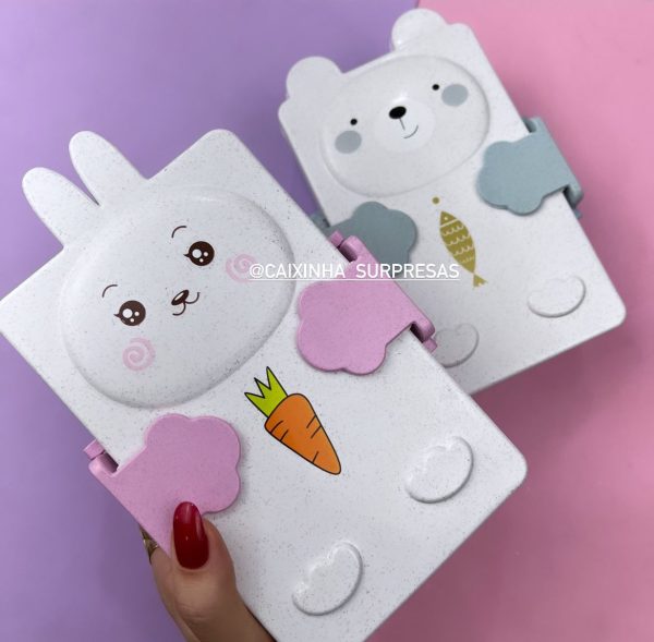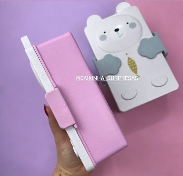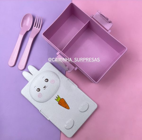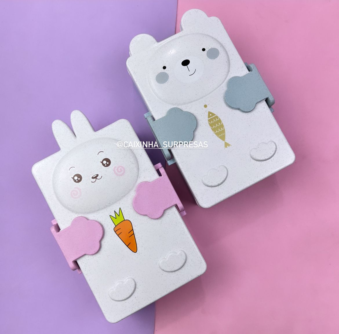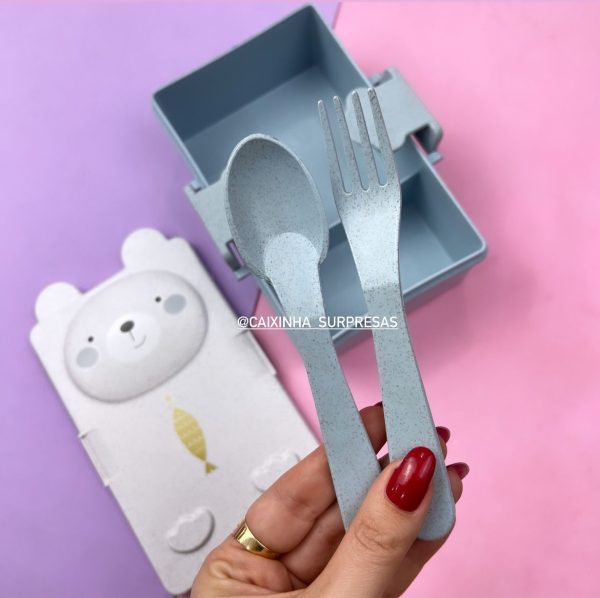 CONTÉM: 1 MARMITINHA DE URSINHO E COELHINHO COM DIVISÓRIA, 2 TALHERES.