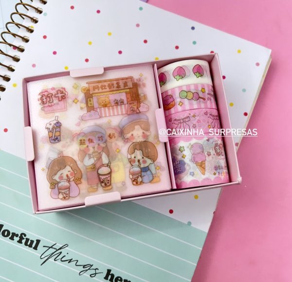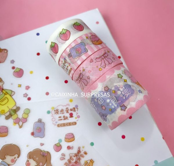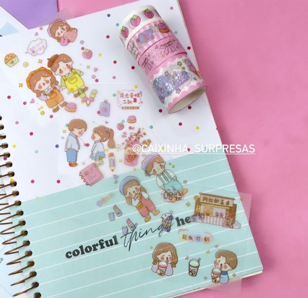 CONTÉM: 4 FOLHAS DE ADESIVOS DIVERSIFICADOS, 3 WASHI TAPES, 1 WASHI TAPE GRANDE.
