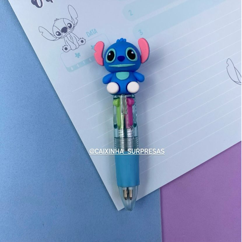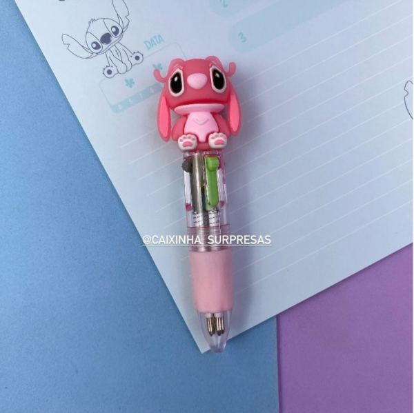 CONTÉM: 1 CANETA COM 4 CORES (AZUL CLARO, ROSA, CINZA E VERDE) STITCH E/OU ANGEL.