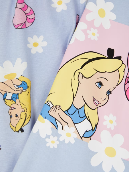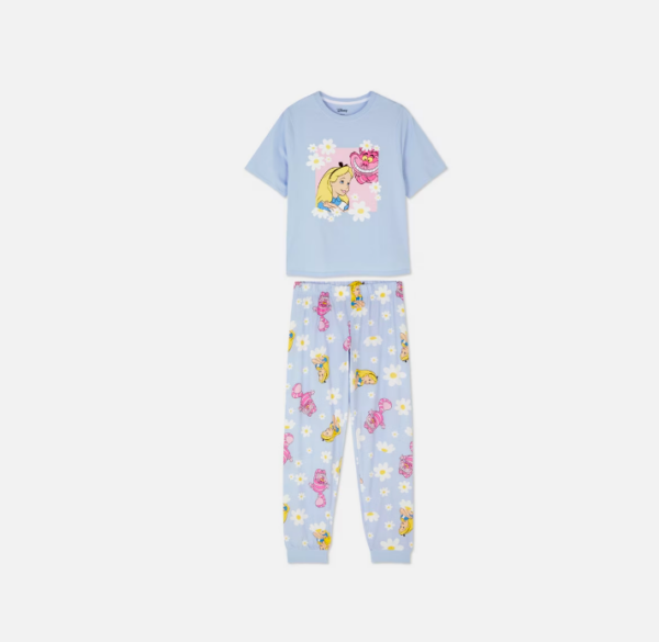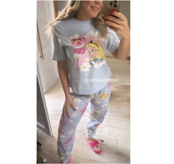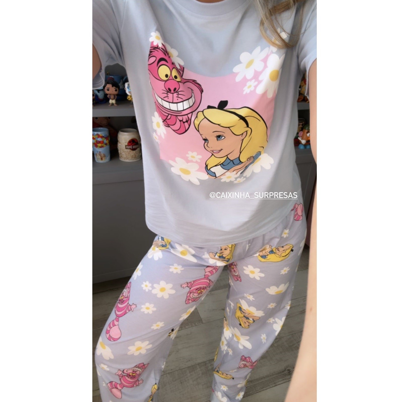 CONTÉM: 1 CONJUNTO DE PIJAMA (CAMISETA E CALÇA) DO CHESHIRE – ALICE NO PAÍS DAS MARIVLHAS.